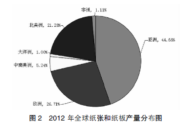世界造紙行業(yè)從20 世紀(jì)80 年代初便開始成功的轉(zhuǎn)向堿性或中性造紙工藝,這極大的提高了造紙對(duì)重鈣的需求,為重鈣產(chǎn)品提供了一個(gè)巨大的應(yīng)用市場(chǎng)。在造紙中添加碳酸鈣可使涂布均勻、亮度好、摩擦度低、結(jié)構(gòu)堅(jiān)實(shí)、易排濕以及易干燥等。2012 年全球紙張和紙板總量為3.998 億t,亞洲、北美洲和歐洲作為全球主要的紙張和紙板生產(chǎn)地,其產(chǎn)量占全球總量的90 %以上,其中亞洲占44.66%,如圖2 所示。
